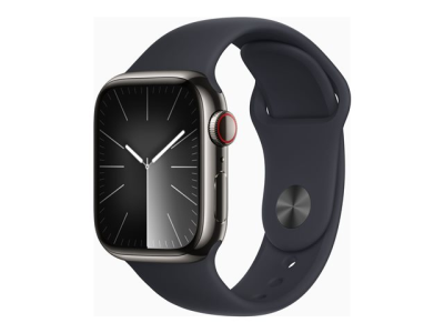 Apple Watch Series 9 (GPS + Cellular) - 41 mm - acier inoxydable graphite - montre intelligente avec bande sport - fluoroélastomère - minuit - taille du bracelet : S/M - 64 Go - Wi-Fi, LTE, UWB, Bluetooth - 4G - 42.3 g MRJ83QF/A